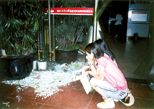 秩序一失控,眾多的歌迷不顧一切地往書城里面擁,而保安則用盡全力往外推-----突然驚叫聲連連,原來書城高大的玻璃門竟然被擠碎了!據(jù)現(xiàn)場的受傷歌迷介紹,當時玻璃碎片、渣滓從天而降,一個女歌迷的臉被推擠在被血染紅的玻璃尖刺上無法動彈!書城工作人員連忙打120叫來了急救車,把受傷的女歌迷送到了四川省人民醫(yī)院急診室。記者在現(xiàn)場看到其中一個女孩的后頸處有一道約5厘米長的血口,另一個女孩則腳淌鮮血,一瘸一拐地走來;她們原本被送到體育醫(yī)院,但因為要縫針才被轉(zhuǎn)送到省醫(yī)院來的。