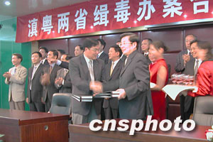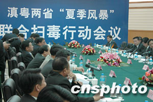 七月二十三日下午,滇粵兩省在昆明舉行“夏季風(fēng)暴”聯(lián)合掃毒行動會議。由廣東省委副書記王華元及副省長李容根率領(lǐng)的廣東禁毒代表團(tuán),與中共云南省委常委李明朝、副省長李漢柏等就雙方建立合作機(jī)制進(jìn)行了深入的探討。兩省警方負(fù)責(zé)人還共同簽署了《滇粵兩省公安機(jī)關(guān)聯(lián)合開展打擊跨區(qū)域毒品犯罪專項(xiàng)行動方案》和《滇粵兩省公安機(jī)關(guān)全面加強(qiáng)緝毒辦案合作協(xié)議》。此舉標(biāo)志著兩省禁毒合作新機(jī)制的全面啟動。按照協(xié)議,兩省將全面加大緝毒情報(bào)交流和辦案執(zhí)法合作力度,組織偵破一批高質(zhì)量、跨區(qū)域、有組織的制販毒案件并將建立若干合作機(jī)制。王華元表示,為加強(qiáng)禁毒工作,廣東省將于近期成立禁毒工作局,增加禁毒力量,并將在各地成立禁毒支隊(duì)。與此同時(shí),還將動員全社會的力量嚴(yán)厲打擊毒品犯罪活動。中新社納家驊/攝