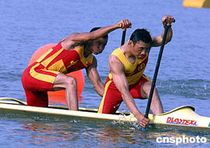 中國國家皮劃艇隊男子劃艇運動員孟關(guān)良(前)、楊文軍(后)七月二十六日在山東日照水庫訓(xùn)練基地進行奧運賽前模擬實戰(zhàn)訓(xùn)練,備戰(zhàn)雅典奧運會。中新社記者:張勤
