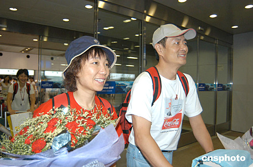 七月二十六日下午,代表全球華人參加二零零四雅典奧運(yùn)圣火希臘本土傳遞的孫雯和濮存昕結(jié)束了華人火炬手的首次奧運(yùn)圣火之旅返抵北京國(guó)際機(jī)場(chǎng)。兩人與成龍作為中國(guó)火炬手于七月二十四日參加了希臘本土的奧運(yùn)圣火傳遞。作者:徐曦弋