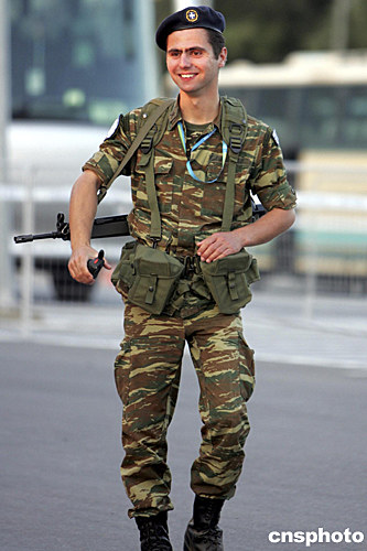 當(dāng)?shù)貢r間8月2日傍晚,一名肩挎微型沖鋒槍的希臘軍警執(zhí)勤后輕松地下崗返回軍營。奧運會期間,雅典奧運會所有場地除了警方嚴加守衛(wèi)外,都有配備沖鋒槍的軍警執(zhí)勤,防范恐怖襲擊。中新社記者:任晨鳴