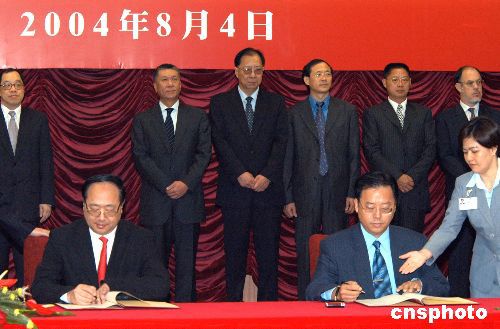 八月四日,中國(guó)人民銀行副行長(zhǎng)李若谷與澳門金融管理局主席丁連星在澳門特區(qū)政府總部多功能廳分別代表雙方簽署澳門銀行辦理個(gè)人人民幣業(yè)務(wù)合作備忘錄,澳門特別行政區(qū)行政長(zhǎng)官何厚鏵等出席簽字儀式。作者:梁永強(qiáng)