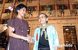 八月五日晚,中央芭蕾舞團(tuán)大樓重新啟用“揭幕儀式”在北京舉行,由此拉開(kāi)了紀(jì)念中央芭蕾舞團(tuán)建團(tuán)四十五周年系列活動(dòng)的序幕。圖為中央芭蕾舞團(tuán)團(tuán)長(zhǎng)趙汝蘅(左)與老一代中芭人戴愛(ài)蓮先生在揭幕儀式上。作者:徐曦弋