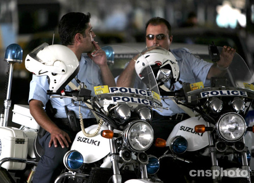 當(dāng)?shù)貢r(shí)間8月6日晚,兩名為奧運(yùn)會(huì)貴賓開(kāi)道的雅典市警察在緊張的工作后,哥倆兒小聚抽支煙解解乏。雅典奧運(yùn)會(huì)開(kāi)支一再超標(biāo),其中投入安保的資金巨大,所有參與的警察通過(guò)各種方式的爭(zhēng)取而獲得了較為豐厚的加班費(fèi)。中新社記者:任晨鳴