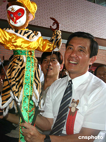 臺(tái)北偶戲館八月七日開張。圖為臺(tái)北市長(zhǎng)馬英九手持一個(gè)孫悟空造型的戲偶出席開幕式。作者:董會(huì)峰