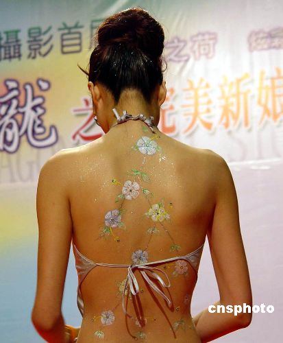 2004年8月7日,南京市某商家在其新產品推介會上,再次請來模特現(xiàn)場彩繪秀,以吸引消費者眼球。作者:王耀武