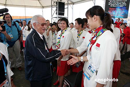 在升旗儀式進(jìn)行的過程中,前國際奧委會(huì)主席薩馬蘭奇在陪同人員的攙扶下抵達(dá)現(xiàn)場(chǎng)。薩翁的蒞臨,引起了全場(chǎng)熱烈的掌聲。中國代表團(tuán)的教練、運(yùn)動(dòng)員紛紛起立與之握手、合影,致使升旗儀式中斷近兩分鐘。在短暫的逗留過程中,薩翁祝愿中國代表團(tuán)取得好成績,為二00八年北京奧運(yùn)會(huì)打好基礎(chǔ)。