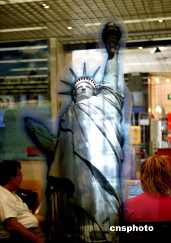 希臘雅典一家旅行社八月九日掛出美國自由女神畫,奧運(yùn)會期間該社將為各國游客提供豐富的旅游服務(wù)。中新社記者:王瑤