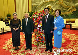 中新社北京八月九日電 (記者 朱大強(qiáng))中國全國人大常委會(huì)委員長吳邦國今天在人民大會(huì)堂會(huì)見了柬埔寨國王諾羅敦·西哈努克和王后諾羅敦·莫尼列·西哈努克。賓主進(jìn)行了親切友好的交談。