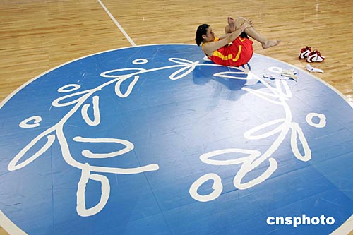 當(dāng)?shù)貢r間八月十日,中國女籃進(jìn)行從克里特島抵達(dá)雅典后的首場訓(xùn)練,宋曉云訓(xùn)練結(jié)束后在有雅典奧運(yùn)會徽的中圈弧內(nèi)進(jìn)行放松運(yùn)動。作者:毛建軍