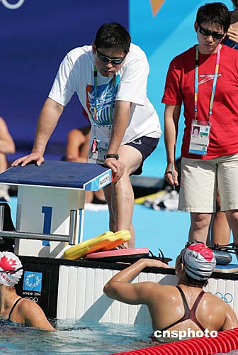 當(dāng)?shù)貢r(shí)間八月十一日上午,中國(guó)游泳隊(duì)教頭趙戈在雅典奧運(yùn)比賽場(chǎng)指導(dǎo)隊(duì)員進(jìn)行熱身訓(xùn)練。中新社記者:毛建軍