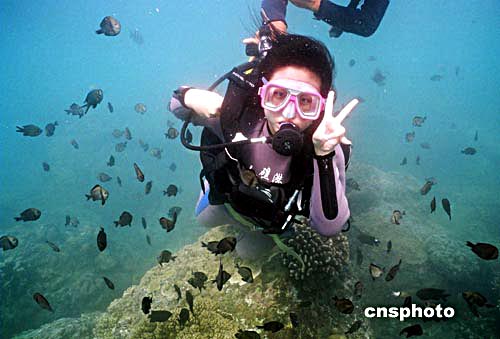 在三亞市,花上三百元左右就能在亞龍灣海中世界潛水觀光,這名中學生潛水正玩得開心。據(jù)悉,今年七月下旬以來,夏令營、學生團、親子游、修學游等各種主題旅游紛紛推出,每天有五六百人的師生團包機來海南,使海南暑期游再現(xiàn)火爆。作者:蔣聚榮