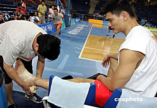 “姚明來(lái)了!”一聲聲欣喜的驚呼后,各路老記從不同的方向奔向已在休息長(zhǎng)椅上坐下的姚明。姚明在隊(duì)醫(yī)的協(xié)助下往腳上裹纏紗布的畫(huà)面被無(wú)數(shù)的照相機(jī)和攝影機(jī)攝入鏡頭。