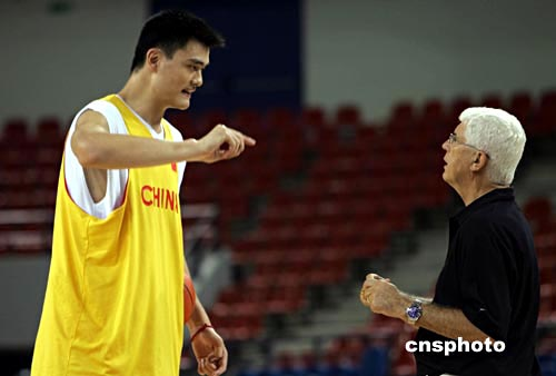 當(dāng)滿頭銀發(fā)的中國(guó)男籃主帥哈里斯姍姍出現(xiàn)在訓(xùn)練館內(nèi)時(shí),隊(duì)員們開(kāi)始集合,此時(shí)比預(yù)定的訓(xùn)練時(shí)間晚了半個(gè)多小時(shí)。在例行的熱身活動(dòng)后,中國(guó)男籃分成黃、紅兩隊(duì)進(jìn)行了幾套戰(zhàn)術(shù)的演練。由姚明、易建聯(lián)、李楠、劉煒、朱芳雨等組成的黃隊(duì)無(wú)疑是中國(guó)男籃的主力陣容。