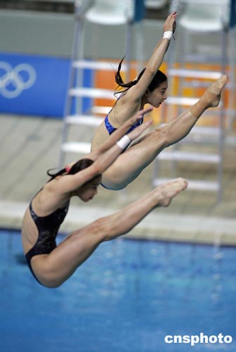 雅典奧運開賽首日(14日)將產(chǎn)生兩枚跳水金牌。郭晶晶與吳敏霞是女子三米板雙人金牌的最大熱門。目前,郭晶晶和吳敏霞正在進(jìn)行緊張的賽前訓(xùn)練。中新社記者:毛建軍