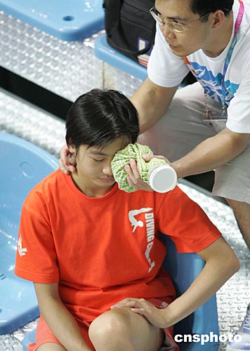 中國(guó)跳水女選手勞麗詩(shī)當(dāng)?shù)貢r(shí)間八月十二日在雅典訓(xùn)練前,由隊(duì)醫(yī)幫助用冰袋治療眼睛疾患。中新社記者:毛建軍