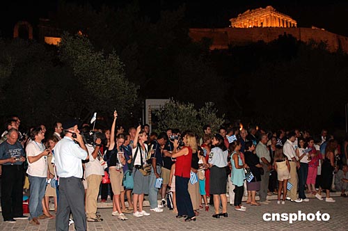 當(dāng)?shù)貢r(shí)間8月12日傍晚,奧運(yùn)火炬即將到達(dá)雅典衛(wèi)城,市民夾道迎接圣火到來(lái)。中新社記者:張煒