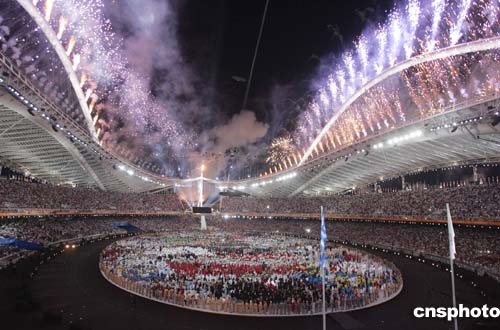 可容納七萬二千名觀眾的雅典奧林匹克體育場(chǎng)座無虛席,主題為“浪漫愛琴!钡拈_幕慶典獨(dú)具匠心,使現(xiàn)場(chǎng)氣氛達(dá)到了高潮。伴隨著悠揚(yáng)的音樂和震天的鼓聲,一道彗星狀火焰從天而降,在“愛琴海”中點(diǎn)燃了奧運(yùn)五環(huán)標(biāo)志。一個(gè)名叫帕薩斯的男孩乘一條白色小船緩緩駛?cè)搿昂!敝,手中揮舞一面希臘國旗。國際奧委會(huì)主席羅格、雅典奧組委主席安吉洛普洛斯和希臘總統(tǒng)斯特凡諾普洛斯三人一起迎接他的到來。此時(shí)體育場(chǎng)大屏幕打出了本屆奧運(yùn)會(huì)會(huì)徽——象征和平與自由的橄欖枝。