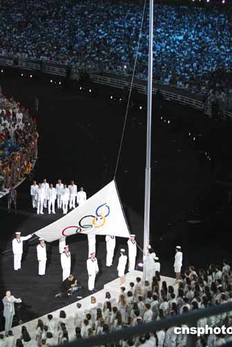 當(dāng)?shù)貢r間八月十三日晚,第二十八屆奧運(yùn)會在希臘雅典開幕,奧運(yùn)五環(huán)旗在會場緩緩升起。中新社記者:毛建軍