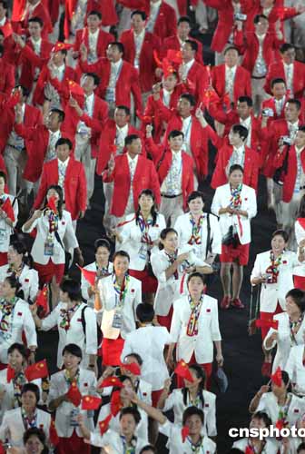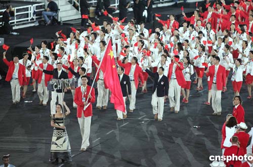 當?shù)貢r間八月十三日晚,第二十八屆奧運會在希臘雅典開幕。圖為中國體育代表團以龐大陣容進入會場。中新社記者:毛建軍