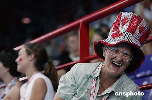 八月十四日,在首日奧運(yùn)會女子羽毛球賽場上,加拿大忠實(shí)的球迷奶奶頭戴楓葉帽,為本國選手助威。中新社記者:王瑤