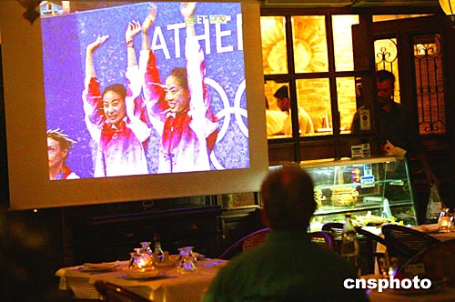 八月十四日晚,中國跳水健兒郭晶晶、吳敏霞為中國隊(duì)獲得一枚奧運(yùn)金牌。圖為雅典市民在一家意大利式餐廳里關(guān)注這一賽事的電視直播節(jié)目。中新社記者:王瑤