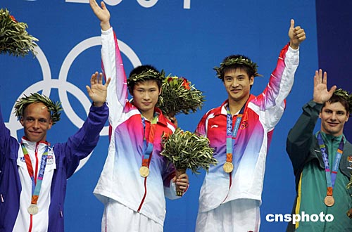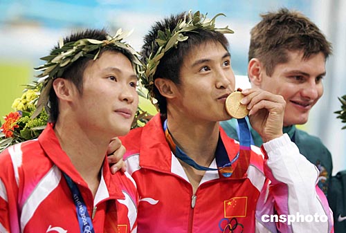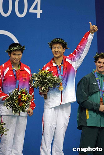 當(dāng)?shù)貢r間八月十四日晚,中國跳水隊田亮、楊景輝在雅典奧運跳水館獲得男子雙人十米跳臺金牌。中新社記者:毛建軍