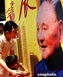 八月十五日在深圳舉辦的朱繼峰紀(jì)念鄧小平誕辰一百周年書(shū)畫(huà)展上,兩位小朋友在鄧小平畫(huà)像前。對(duì)鄧小平有特殊感情的深圳人目前正采取多種形式紀(jì)念這位偉人。中新社記者:宋吉河