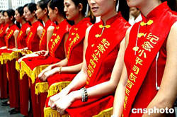 為期一周的朱繼峰紀(jì)念鄧小平誕辰一百周年書(shū)畫(huà)展八月十五日在深圳舉行,身披彩帶的禮儀小姐陣容洋溢著喜慶氣氛。中新社記者:宋吉河