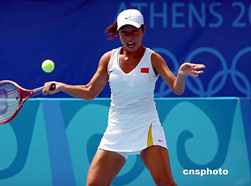 中國唯一參加雅典奧運會女子網(wǎng)球單打比賽的鄭潔,當(dāng)?shù)貢r間8月15日首輪迎戰(zhàn)日本名將山杉愛,在大好局面下可惜以微弱比分失敗。中新社記者:任晨鳴