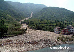 被山群圍繞的災(zāi)害現(xiàn)場,七八百米長的坡型谷地堆積了數(shù)萬方從山上瀉下的石塊,大的有數(shù)噸重,泥石流所到之處的民房只剩兩間孤立在坡地西側(cè),但一樓的墻體已被泥石流擊毀;東面谷地邊的小學(xué)教學(xué)樓一樓的兩間教室被泥石流擊穿,里面堆滿了石塊和泥土;谷地正面靠河邊的中學(xué)樓房也多處受損。依著村民手指的方向可以清楚地看到,在谷地里面一座高聳的大山上,有一道長長的新裸露的溝壑,村主任潘行岳說:“泥石流就是從那兒下來的!
