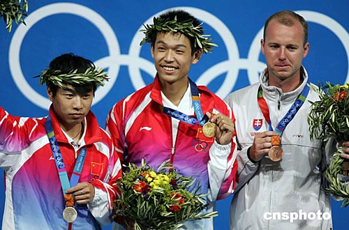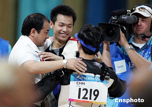 當?shù)貢r間八月十六日,中國選手朱啟南(左)與李杰在雅典奧運男子十米氣步槍射擊比賽中分獲金、銀牌。朱啟南并以七百零二環(huán)的成績打破世界紀錄。中新社記者:毛建軍