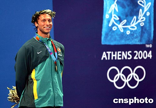 幾乎與第二十八屆奧運(yùn)會(huì)絕緣的澳大利亞飛魚索普,當(dāng)?shù)貢r(shí)間8月16日晚在雅典奧運(yùn)會(huì)男子100米自由決賽中獲得冠軍,再次登上冠軍領(lǐng)獎(jiǎng)臺。中新社記者:任晨鳴