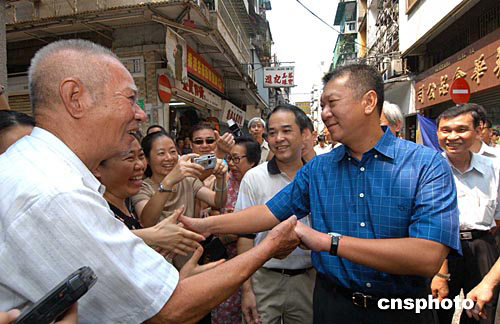 十七日上午,澳門(mén)特別行政區(qū)第二任行政長(zhǎng)官候選人何厚鏵繼續(xù)展開(kāi)了為期二周的競(jìng)選宣傳活動(dòng),在十月初五街何厚鏵與街坊們熱情握手,感謝他們的支持。作者:梁永強(qiáng)