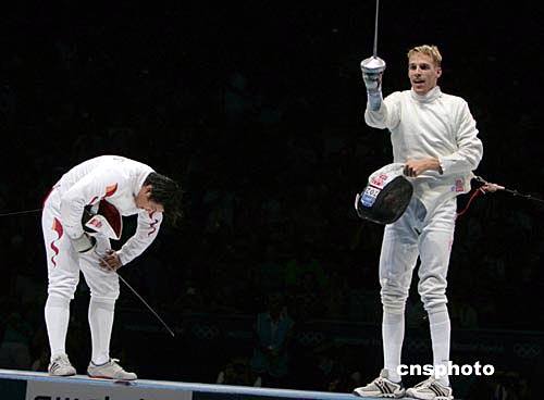 當?shù)貢r間8月17日晚,中國劍客王磊在雅典奧運會男子重劍決賽中以9:15不敵瑞士名將費舍爾,獲得亞軍。中新社記者:任晨鳴
