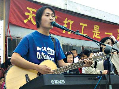 “打工青年藝術(shù)團(tuán)”成立于2002年5月1日,初始團(tuán)員10人,都是來自各行各業(yè)的打工青年,他們利用業(yè)余時間到工地、工廠和小區(qū)給打工者們演出,兩年來共演出了100多場,累計觀眾達(dá)到了20000多人次,在北京打工者中間受到熱烈的歡迎,很多人直接從觀眾加入到了演員隊伍。隨著影響的擴(kuò)大,他們還成立了“農(nóng)友之家”社會公共服務(wù)機(jī)構(gòu),為打工者提供法律咨詢、文化教育、權(quán)益維護(hù)、大眾電腦教室、社區(qū)互助圖書館等多方面的幫助。