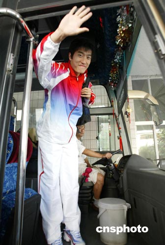 8月18日,中國田徑隊包括劉翔在內(nèi)的第二批運動員在北京國家體育總局訓練局集合,踏上赴雅典奧運會的征程。圖為劉翔蹬車向隊友揮手告別時顯得信心十足。中新社記者:盛佳鵬