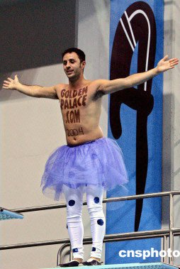 一名男子居然在無人看管下站到了正在雅典舉行的奧運會3米跳板上,他胸前寫著""是一個賭博網(wǎng)站的名子。