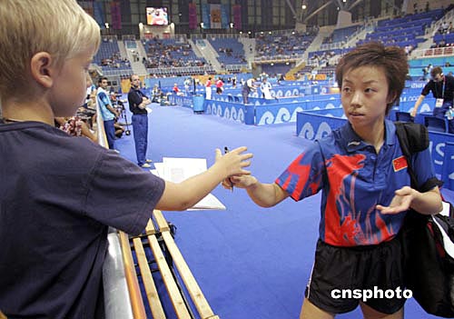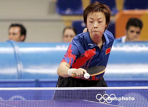 在雅典時間18日晚進行的奧運乒乓女單比賽中,中國選手張怡寧以四比一戰(zhàn)勝中國香港選手柳絮飛,晉級八強。中新社記者:張煒