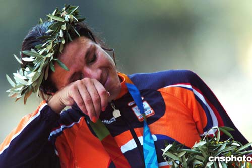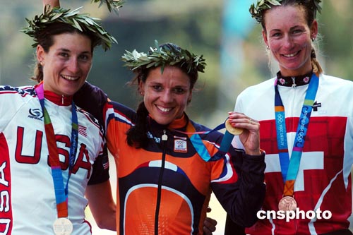 當?shù)貢r間8月18日,荷蘭選手Zijlaard-van-Moorsel喜摘女子自行車24公里賽桂冠。圖為她和亞軍美國選手Deidre Demet-Barry及銅牌得主Karin Thuerig一起登上領(lǐng)獎臺。