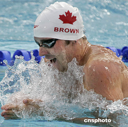 圖為在當地時間8月18日舉行的男子200米仰泳和蛙泳的比賽中,加拿大選手的出色表現(xiàn)。