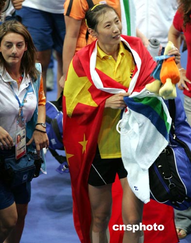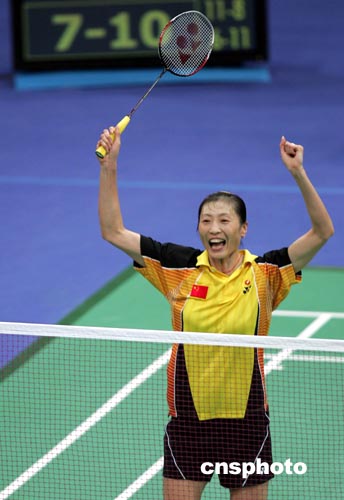 當(dāng)?shù)貢r(shí)間八月十九日下午,中國(guó)羽毛球名將張寧以2:1力克荷蘭選手張海麗,獲得本屆奧運(yùn)會(huì)女子單打冠軍,從而使中國(guó)金牌總數(shù)躍升至12枚。中新社記者:任晨鳴