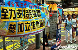 香港2004年立法會選舉在即,民建聯(lián)八月十九日在灣仔鬧市街頭懸掛出醒目的標(biāo)語為參加立法會選舉造勢。中新社記者:錢興強(qiáng)
