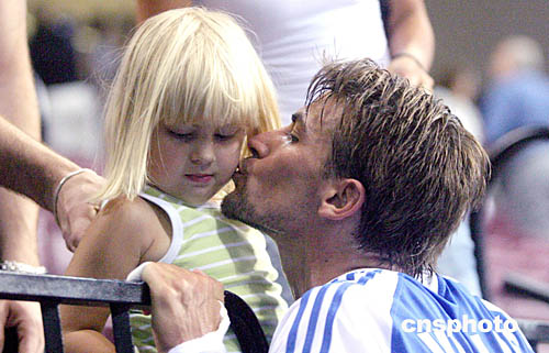 圖為在當(dāng)?shù)貢r間8月18日舉行的男子手球比賽中,希臘選手Vago VOGLIS給場邊一小球迷深情一吻。