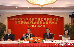澳門特別行政區(qū)第二任行政長官候選人何厚鏵,十九日在濠景酒店與澳門旅游及飲食界代表舉行座談會(huì),聽取業(yè)界人士在經(jīng)營旅游及飲食業(yè)中存在的問題及意見。作者:梁永強(qiáng)