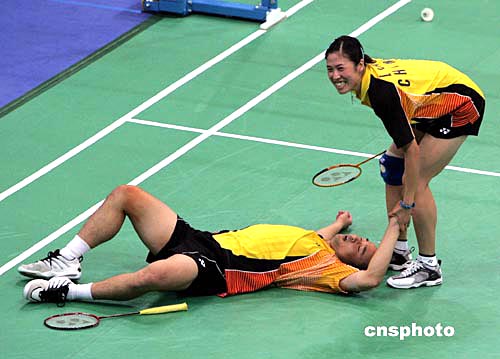 決勝局,張軍/高崚在開局連取三分后十多分鐘內(nèi)一直在看著對手不停地得分,急性子的張軍進攻不力,而且連續(xù)出現(xiàn)失誤。好在英國球員在十一比八領(lǐng)先時心理上也出現(xiàn)變化,失誤增多,中國球員乘機反撲,連奪六分拿到了冠軍點,并以十五比十二取得了最后的勝利。