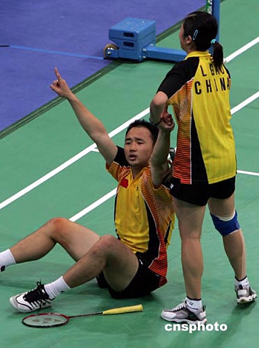 中新社雅典八月十九日電 悉尼奧運會冠軍張軍/高崚今天在奧運會羽毛球混合雙打決賽中苦戰(zhàn)九十三分鐘,以二比一戰(zhàn)勝英國選手羅伯森/埃姆斯,成為第一對在奧運會上成功衛(wèi)冕的羽毛球運動員。