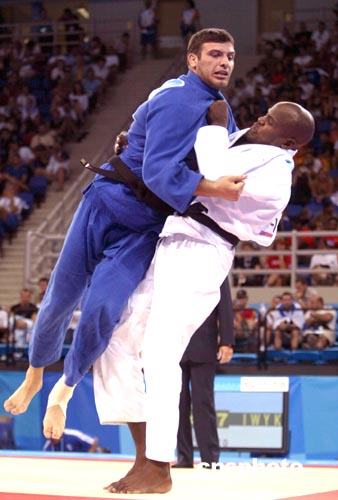 當地時間8月19日,希臘選手Vasileios與古巴選手Oreidis在男子100公斤級柔道賽場上一爭高下。