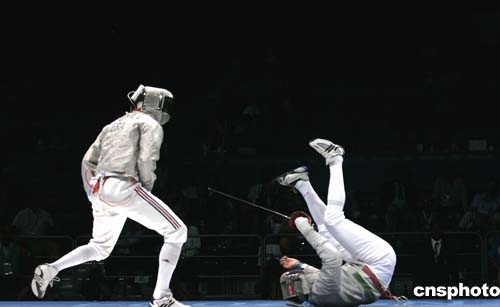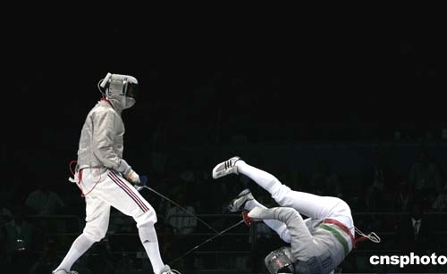 圖為當(dāng)?shù)貢r間8月19日進行的男子擊劍團體賽中,獲得冠軍的法國隊在決賽中對陣意大利隊的場景。