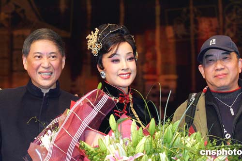 | 根據(jù)臺(tái)灣白先勇的作品《金大班的最后一夜》改編而成的同名大型歌舞話劇,一月六日晚在上海上演。著名演員劉曉慶領(lǐng)銜主演,該劇敘述的是上個(gè)世紀(jì)四十年代至六十年代,從上海“百樂門”到臺(tái)北“夜巴黎”的一段風(fēng)花雪月的故事,講述一位風(fēng)華絕代的舞女大班金兆麗的傳奇。圖為白先勇(左)向主演劉曉慶及導(dǎo)演熊源偉祝賀。作者:潘索菲